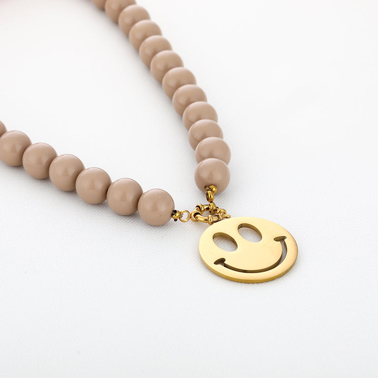 Taupe kralenketting met gouden stainless steel smiley
